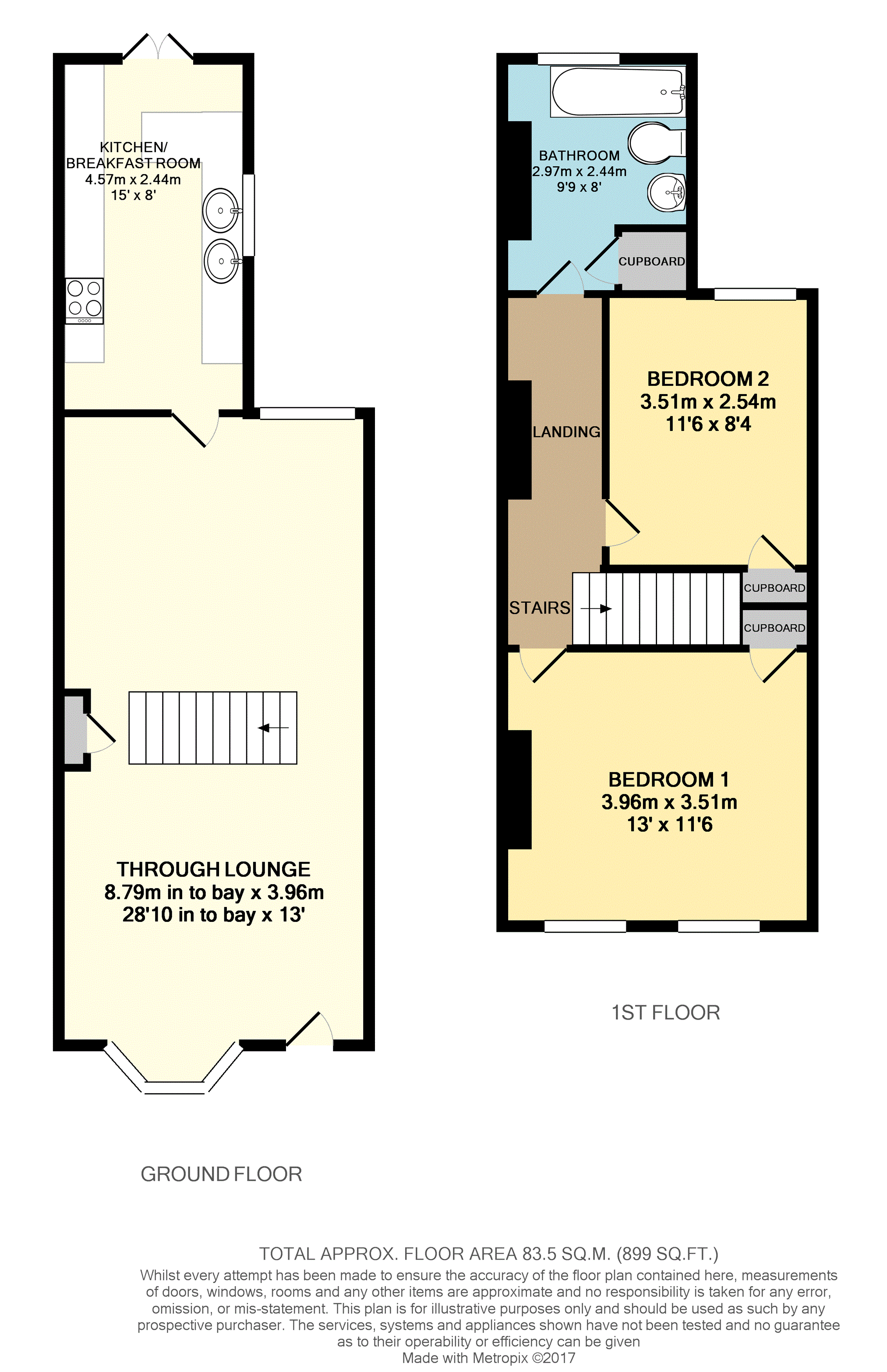 Stairs lead up from the middle of the through lounge to the first floor where here you have a landing area, two double bedrooms and a new modern bathroom. There is access to loft space and built in wardrobes/storage in both bedrooms.