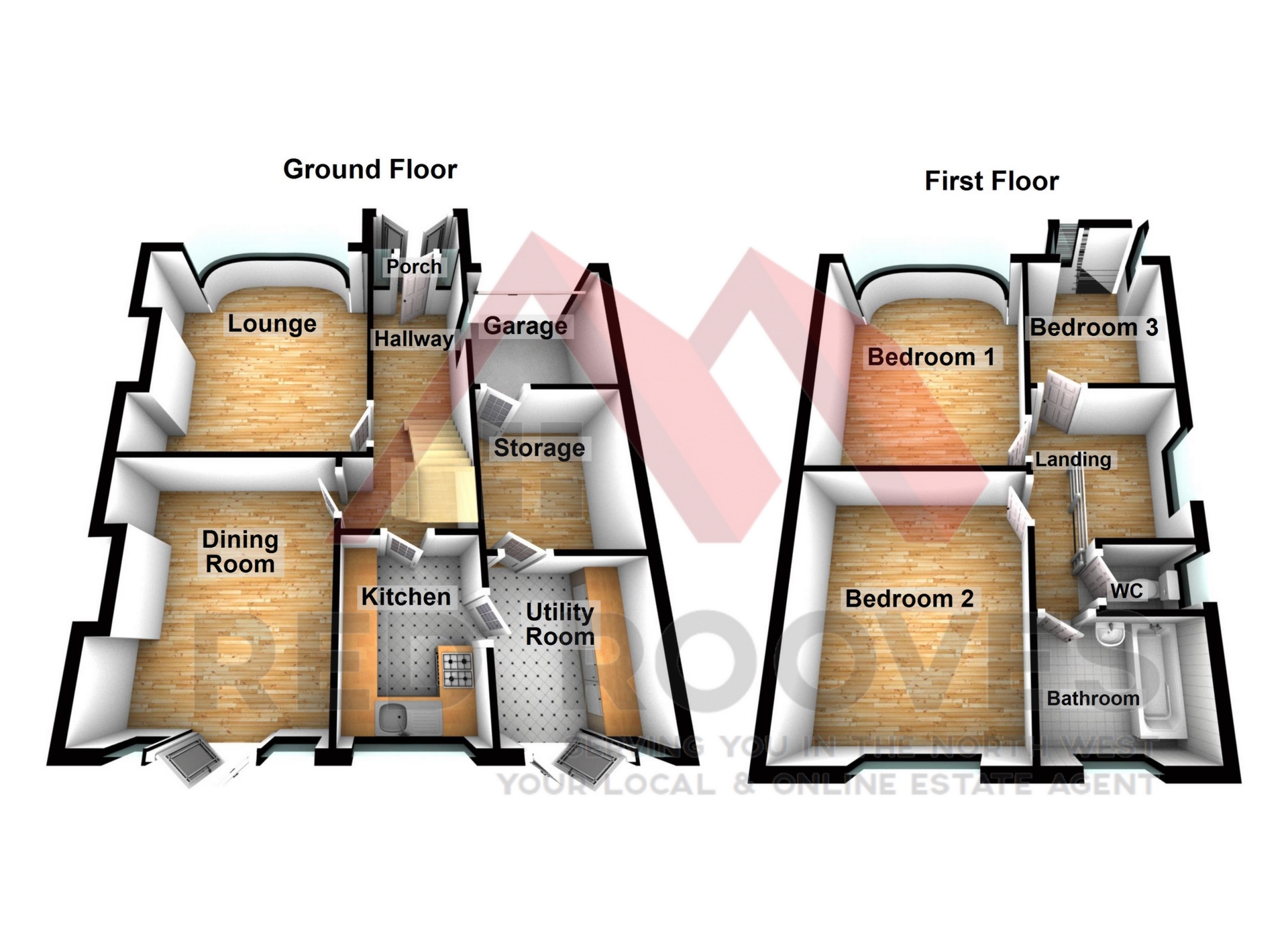 To the front of the property is a brick wall perimeter with an opening for a car, fully paved front garden and established shrubbery to the front corner. You enter the property through double glazed French doors into the porch area. An internal double-glazed door then leads to the hallway. Here access is provided to the lounge, dining room, kitchen and first floor. The lounge is a spacious and bright room with a large curved bay window to the front of the room, an electric fireplace, carpet to the floor and an original hardwood door leading to the hallway. The dining room, like the lounge contains a lot of natural light due to the rear aspect French doors with corresponding windows to the top of the doors and to either side, providing access to the rear garden. The room contains laminate flooring and is of a neutral décor. Into the kitchen, the room provides plenty of storage and cooking space via the range of matching wall and floor units. There are integrated appliance consisting of an oven, hob, extractor, Bosch dishwasher, fridge/freezer, microwave and sink. Finishing off the room are the LED inset spotlights and tiled floor. This room also provides access to the utility room. The utility room contains plumbing and electrics for a washing machine and dryer, matching wall units finished with a rolled edge worktop and laminate flooring. From here you can access the rear garden via a double-glazed back door and the storage area. The storage area contains a range of cupboard and a door to access the garage.
