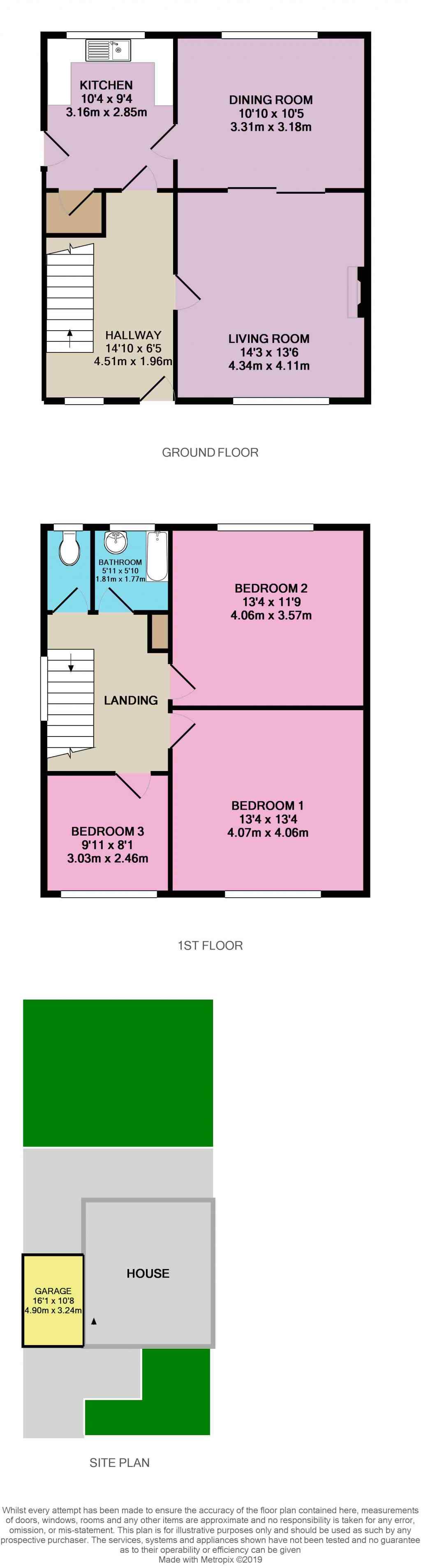 Brick built single garage with up and over door to front. Door from garden for access. Electrics and lighting.