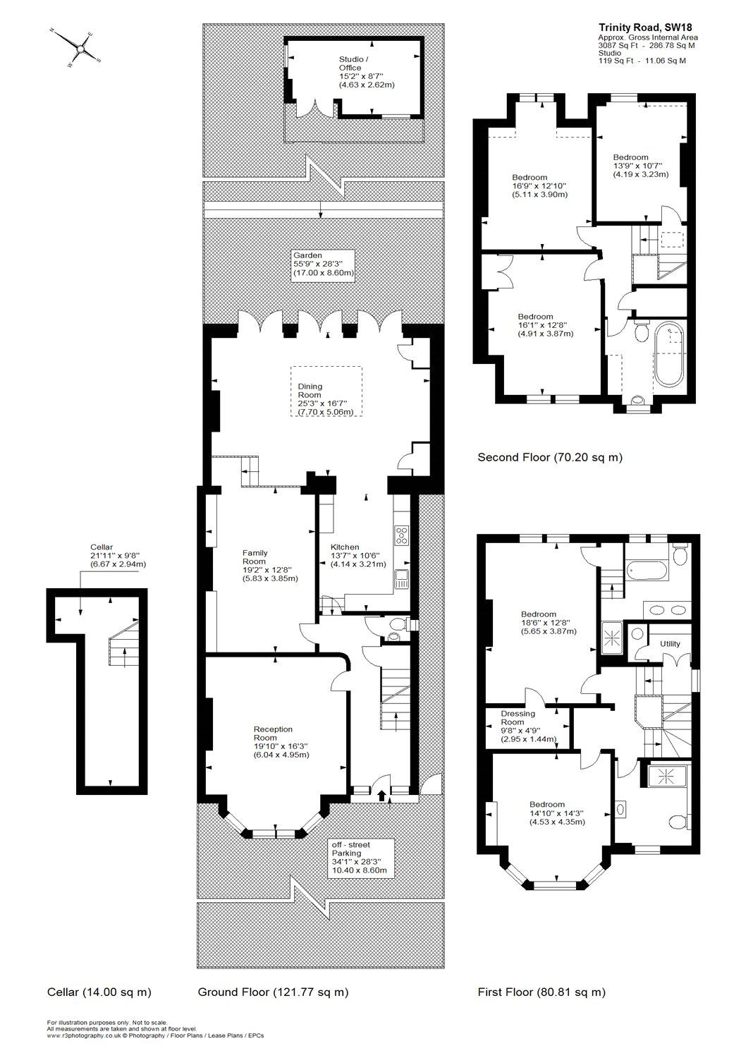 The upper floors have flexible bedroom accommodation with five bedrooms and three bathrooms. Future development could be possible by extending downwards into the basement.
