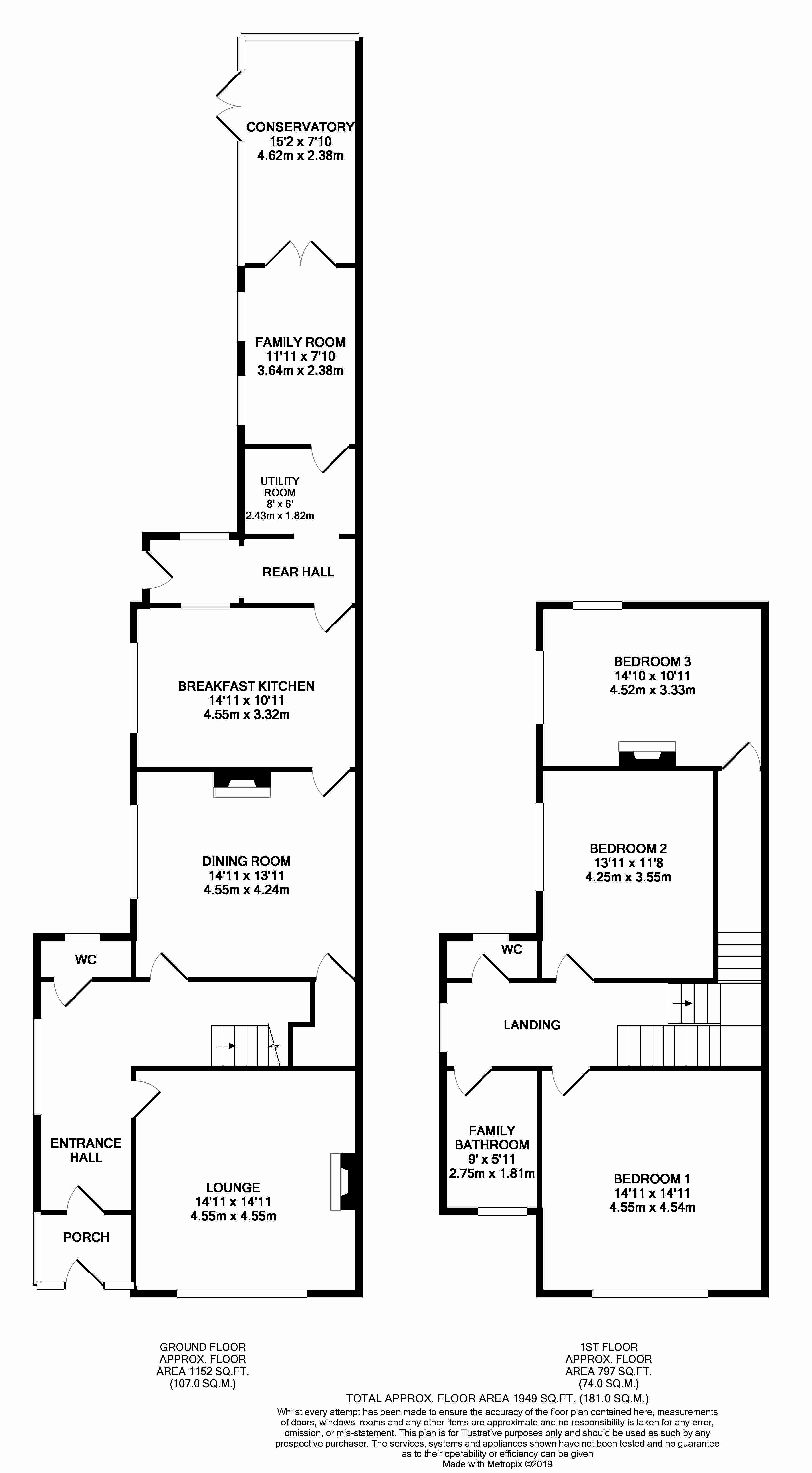 bedroom 3 14' 10" x 10' 11" (4.52m x 3.33m) Upvc double glazed windows to side and rear elevation, original cast iron fire place, pedestal wash hand basin, central heating radiator.