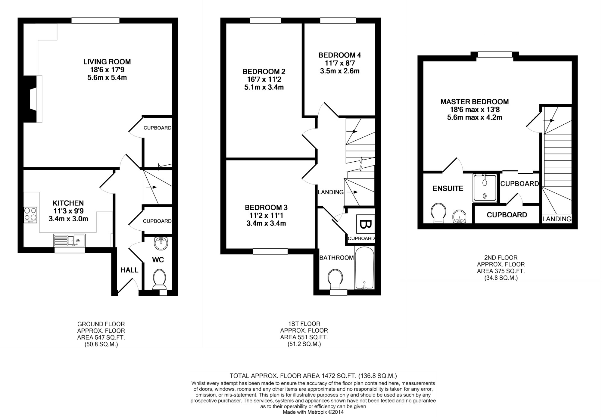 The well-presented accommodation spans across three floors extending in all to 1,472 . At the heart of the house is a particularly spacious 18' living room which features a large fireplace with newly added wood burning stove, oak flooring and French doors opening to the rear garden. Also on the ground floor is a well equipped kitchen, entrance hall, cloakroom and useful cupboards and additional storage. Upstairs, there are three double bedrooms on the first floor served by a family bathroom whilst the master bedroom occupies the whole of the top floor with a stylish en suite and ample built in wardrobes. The house is fully double glazed and has central heating to radiators throughout.