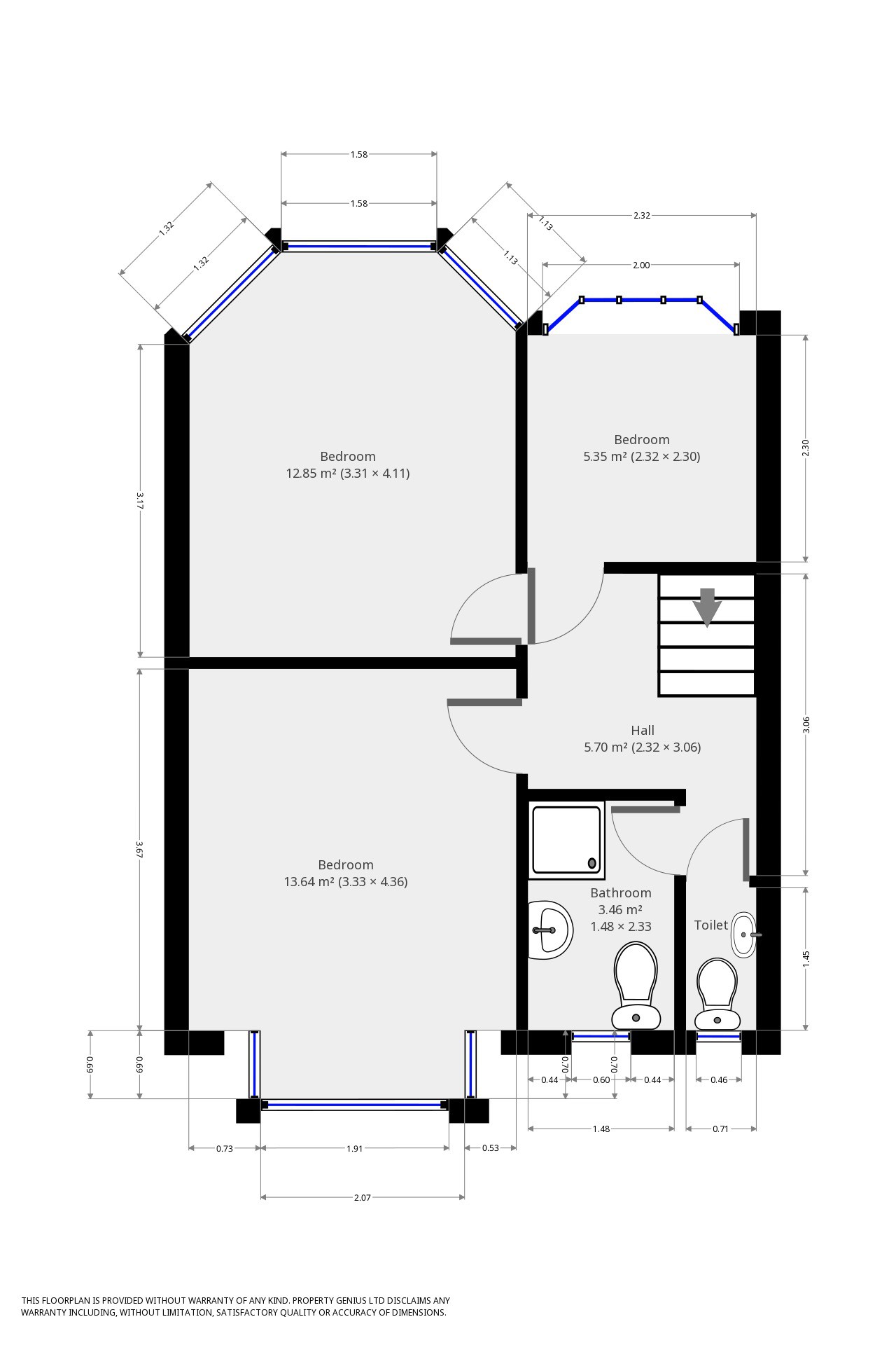 Wooden door, UPVC double glazed windows, plastered walls with decorative coving and picture rail, carpet flooring, bay window, pendant light, GCH radiator
