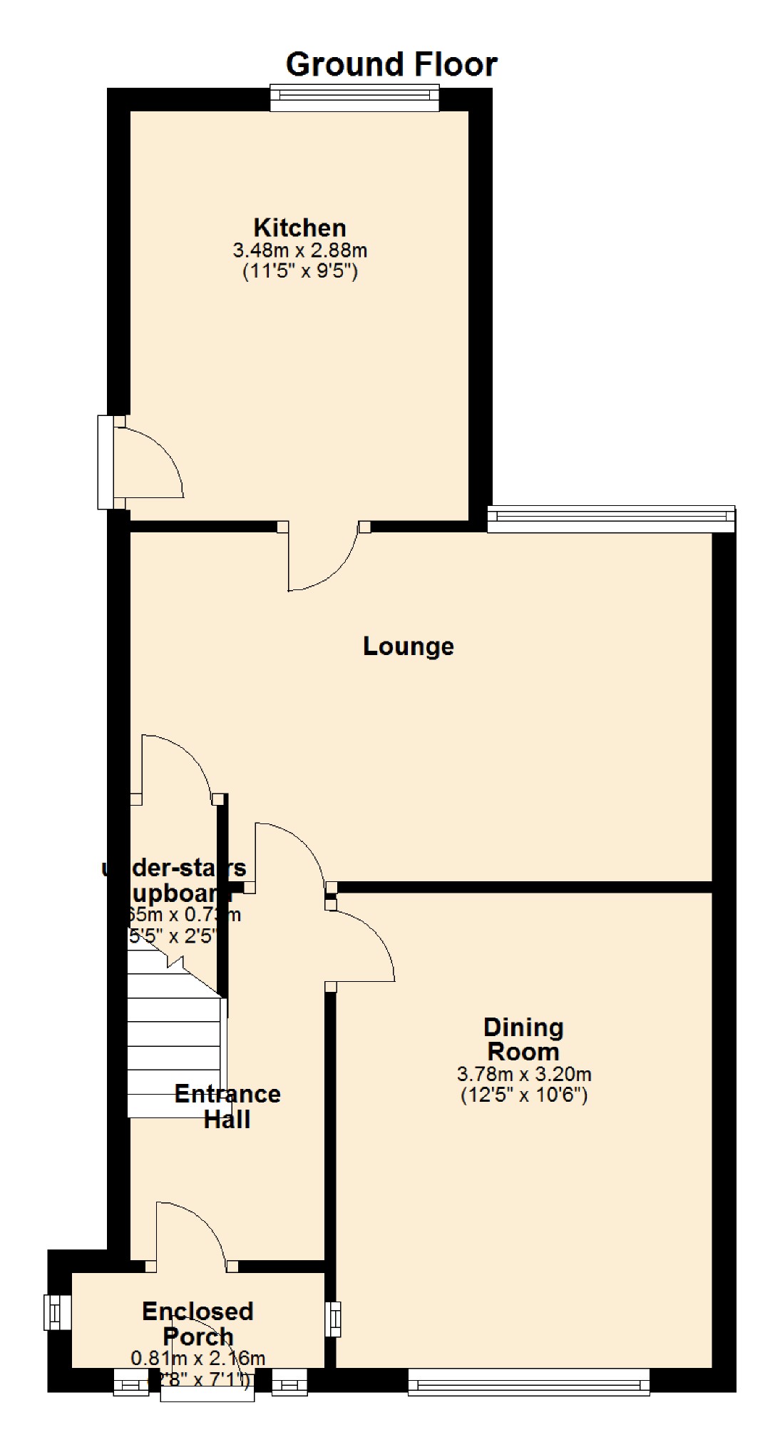PVCu double glazed window to rear, coal effect gas fire with feature surround, radiator, TV point, power point(s), two wall lights, door to the kitchen, door to the under stairs cupboard.