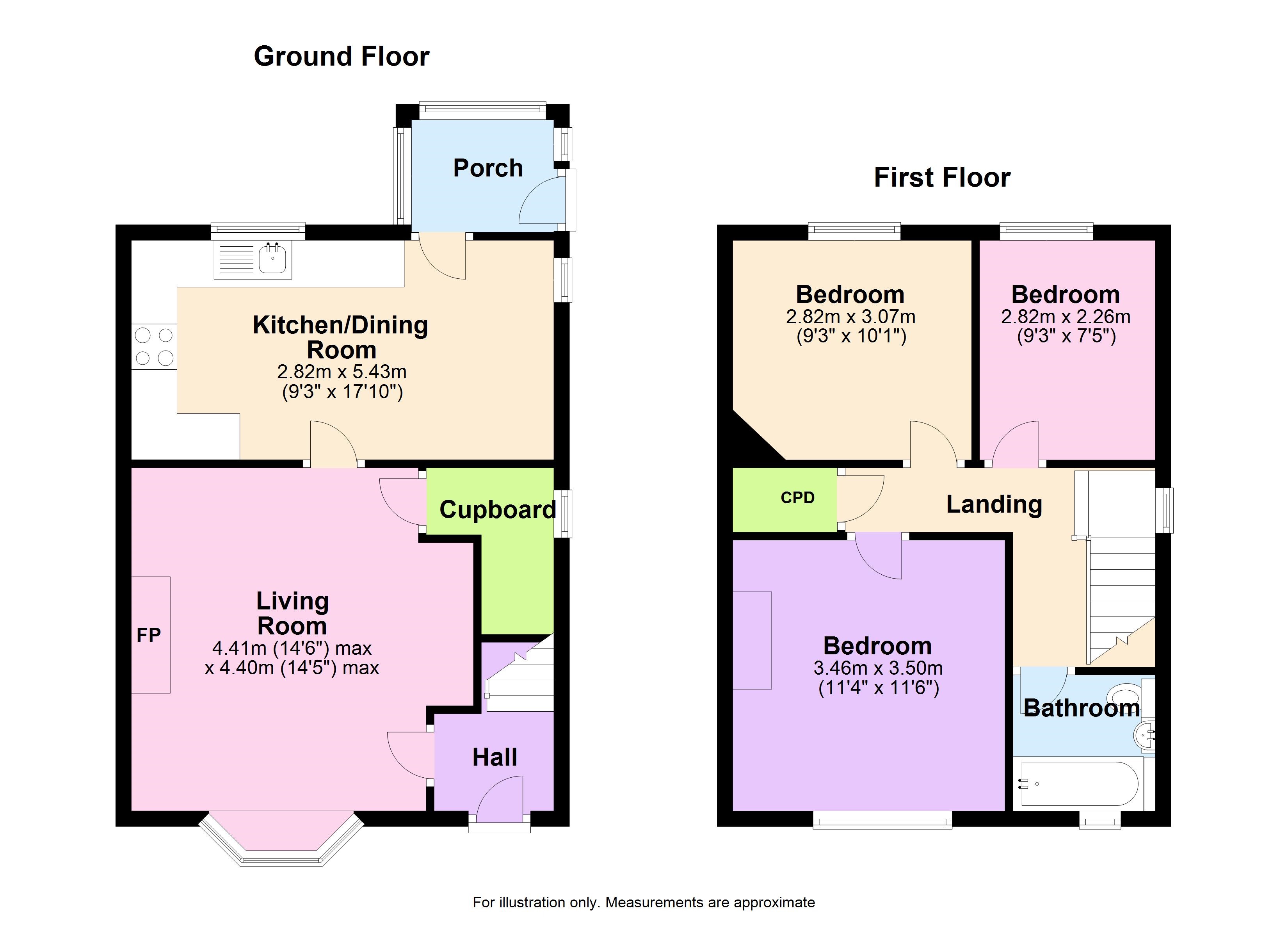 Bow window, feature fireplace and surround, understair storage, radiator, carpet flooring.