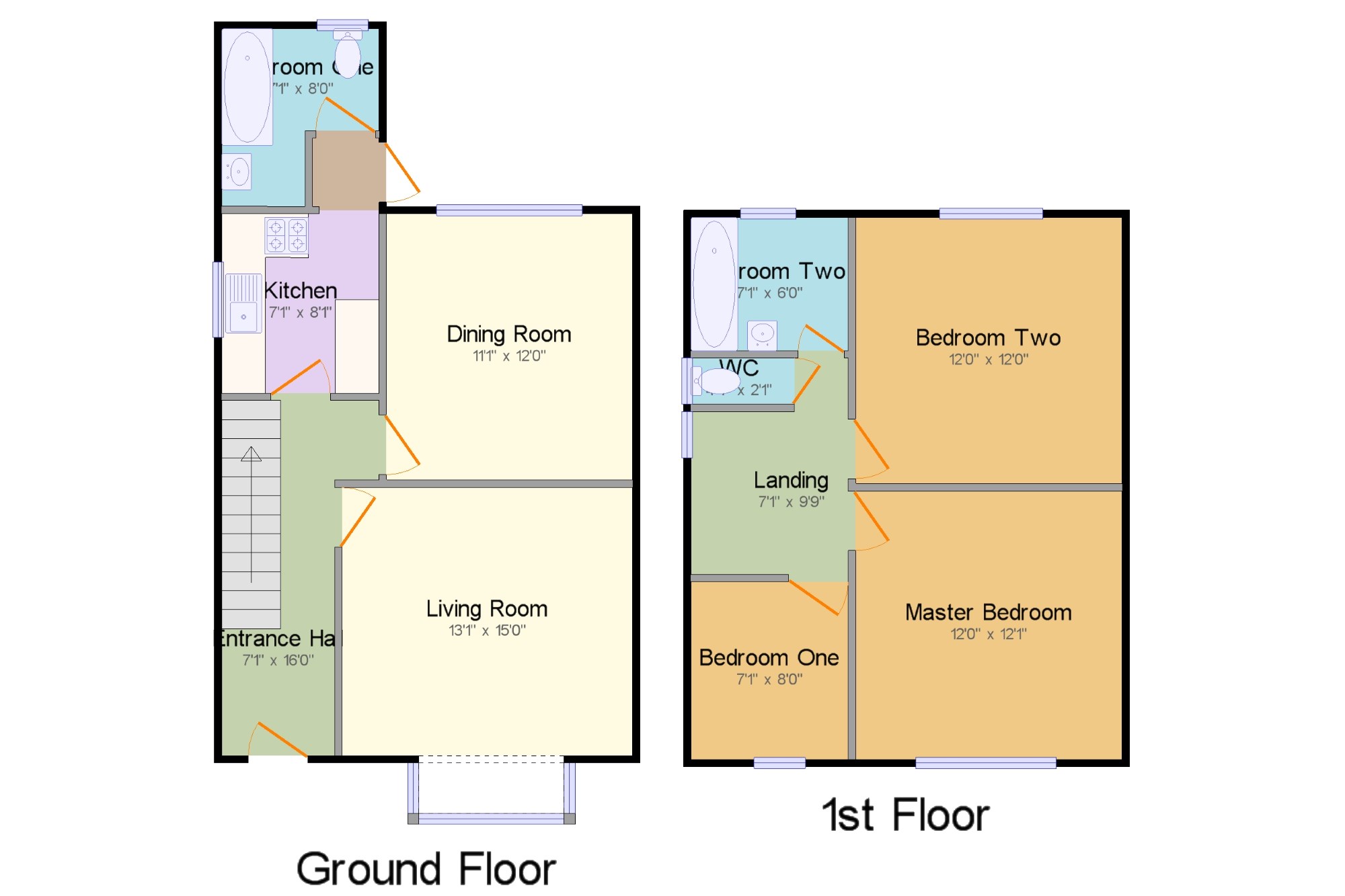 Bathroom One 7'1" x 8' (2.16m x 2.44m). Double glazed uPVC window with obscure glass. Double radiator, vinyl flooring, painted plaster ceiling, ceiling light. Low level WC, panelled bath with mixer tap, shower over bath, pedestal sink with mixer tap, extractor fan.