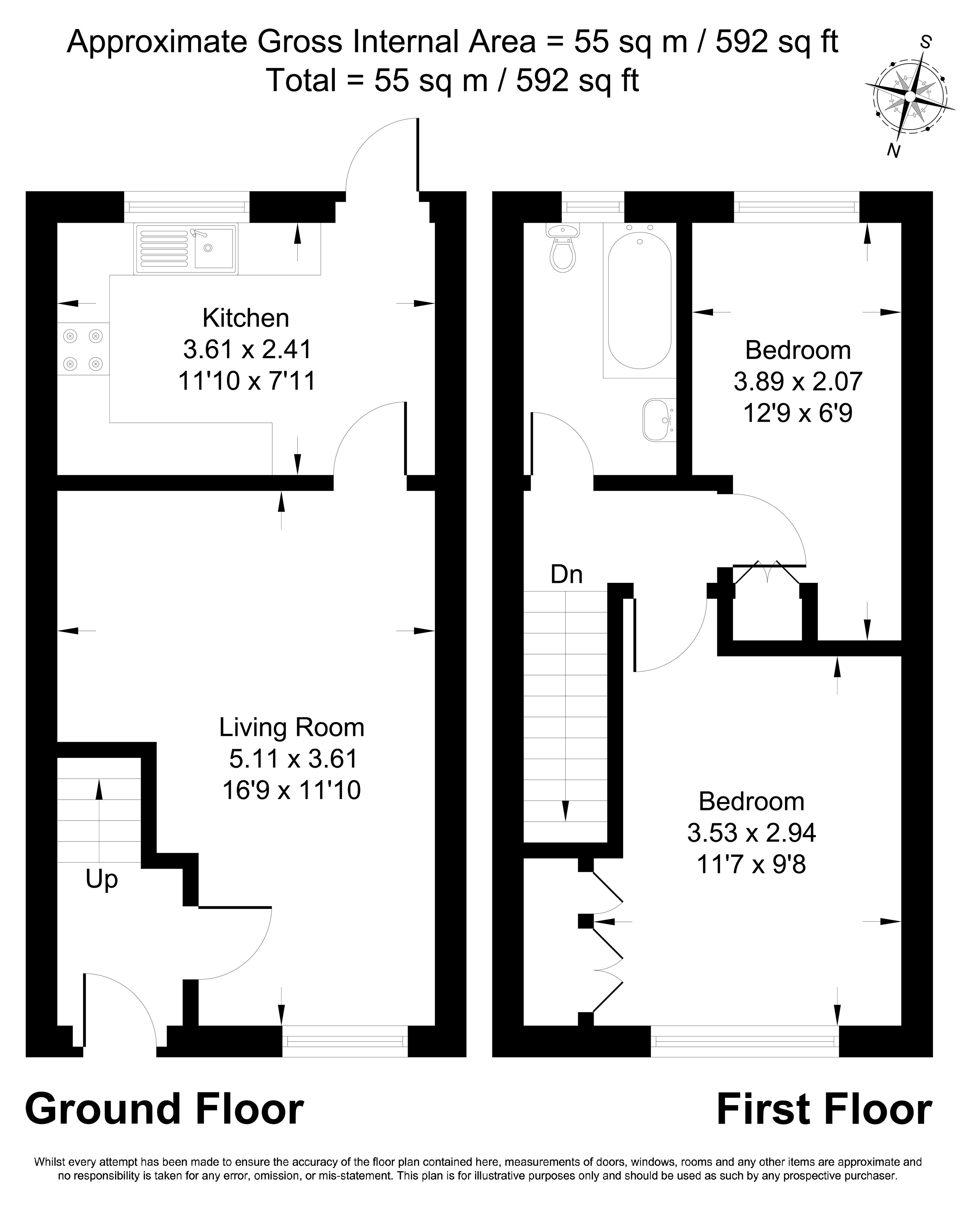 On the first floor you will find two bedrooms and a family bathroom. The master bedroom is located at the front of the property. There is comfortably space for a double bed with side tables as well as the added bonus of built in wardrobes. Much like to rest of the property, it is neutral and bright with laminate flooring. The second bedroom has views out to the rear garden and has previously has a double bed but is now being used as a dressing room by the current owners. The family bathroom has been recently updated. It has a white suite with bath, toilet and hand basin with vanity. It is mostly tiled and has a mosaic trim.