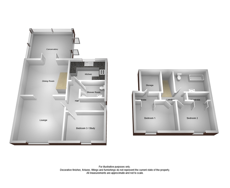 Briefly comprising entrance hallway, lounge, dining room, conservatory, kitchen, shower room and bedroom. To the first floor, landing, family bathroom and two bedrooms both of which have built-in wardrobes with a doorway leading from the wardrobes in bedroom one through to a dressing area.