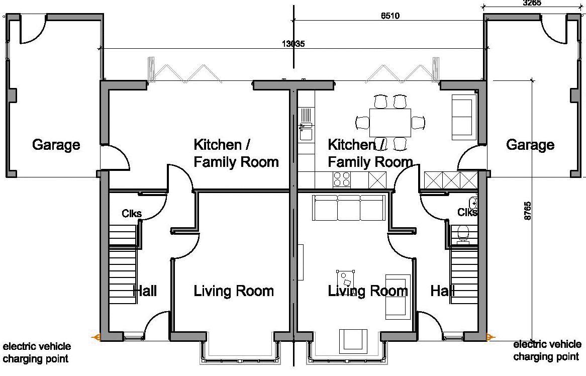 Impressive open plan living kitchen perfect for modern family life with enough space for cooking, relaxing and dining. The kitchen is fitted with a range of wall and base units, a drainer sink, integrated oven, fitted fridge freezer, island unit with electric hob and extractor over. Double glazed sliding patio doors let plenty of natural light in and lead into the garden.