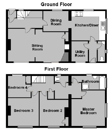 Entrance via driveway with gate into rear garden, step into double glazed back door and into Hallway. Door to Cloakroom with ceramic tiled floor, heated towel radiator, low level w.C, wash hand basin and obscure glazed window to side aspect. Door into Utility Room with space for appliances, rolled edge worktop, window to rear aspect, wall mounted Remeha Avanta boiler and wall mounted cupboards. Door into Kitchen/Diner with newly fitted kitchen ceramic tiled floor, range of wall and base units, roll edged work tops, single drainer sink unit with monobloc mixer tap over, double glazed window to side and front aspect, space for range cooker with stainless steel extractor hood over and opening into Dining Room. The Dining Room has ceramic tiled floor and a double glazed window to front aspect. Further doorway into Inner Hallway with stairs to first floor and hardwood glazed door to hallway with ornate front door. Door into Sitting Room with exposed wood floor, double glazed window to rear aspect and patio doors, inglenook fireplace with wood burning Village stove. Exposed wooden stairs to the first floor lead to all four bedrooms and the family bathroom. Master Bedroom has exposed wooden floor boards, double glazed window to rear and side aspect. Bathroom with vinyl floor, obscure glazed window to front and side aspect, white suite with bath, wash hand basin and stand alone shower cubicle. Separate w.C. With obscure double glazed window to front aspect and vinyl floor. Bedroom Two has exposed wooden floorboards, secondary glazed window to rear aspect, fitted cupboards and picture rail. Bedroom 3 has secondary glazed window to rear aspect. And exposed wood floor. Bedroom Four has secondary glazed window to front aspect with alcove recess cupboard. There are wall mounted radiators throughout. There are two loft hatches and space that could be used as a study area on the landing.