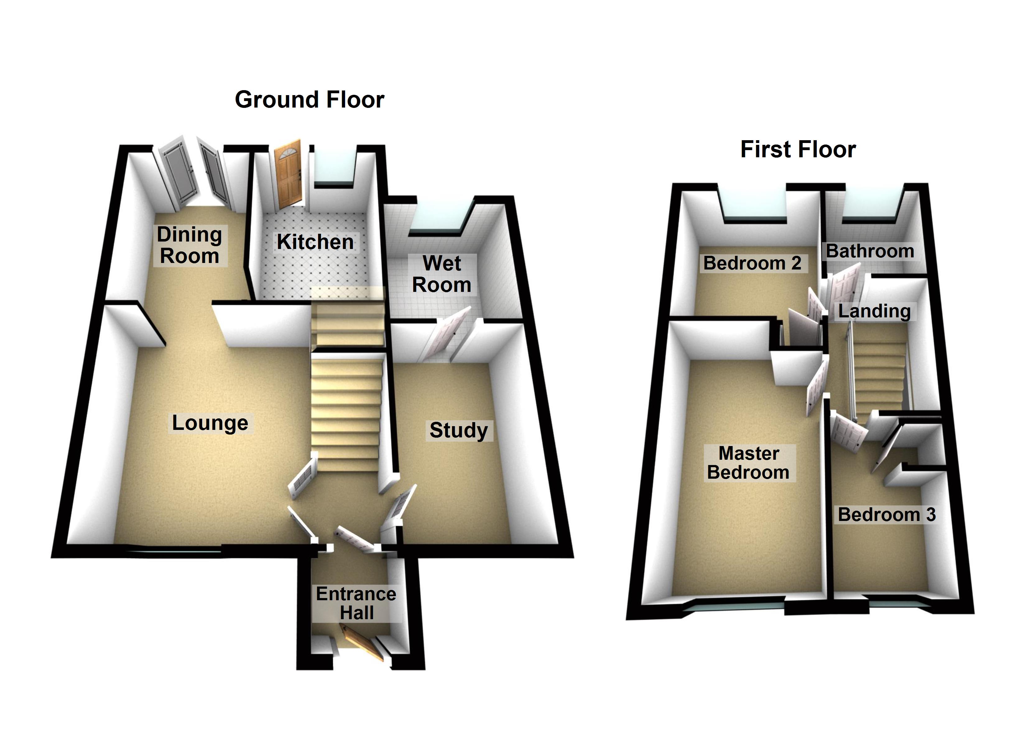 Hallway Stairs to first floor, door to lounge and study.