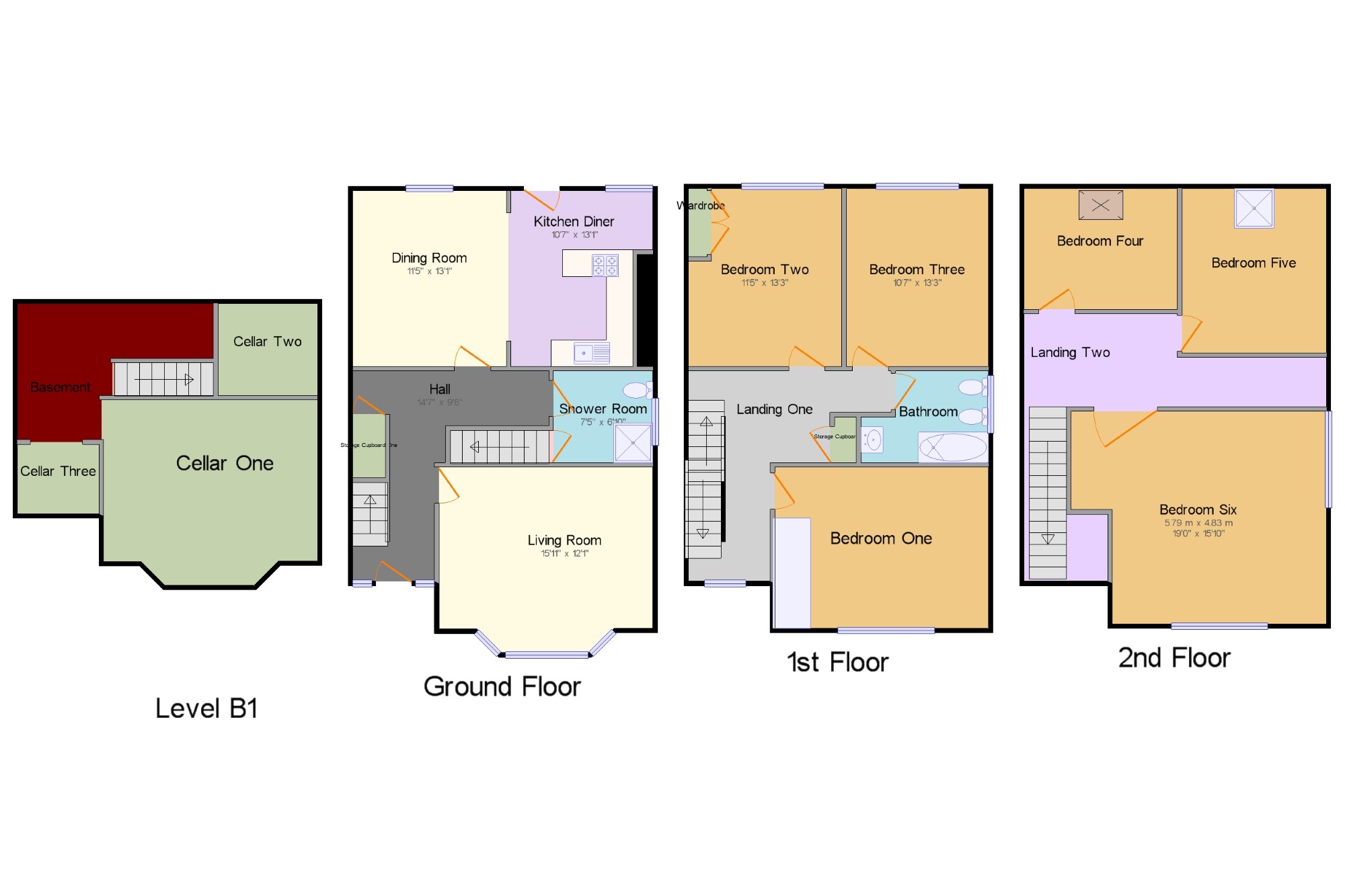 Bedroom Six19' x 15'10" (5.8m x 4.83m). Double bedroom; double aspect single glazed wood windows with obscure glass facing the rear and side. Radiator, carpeted flooring, ceiling light.