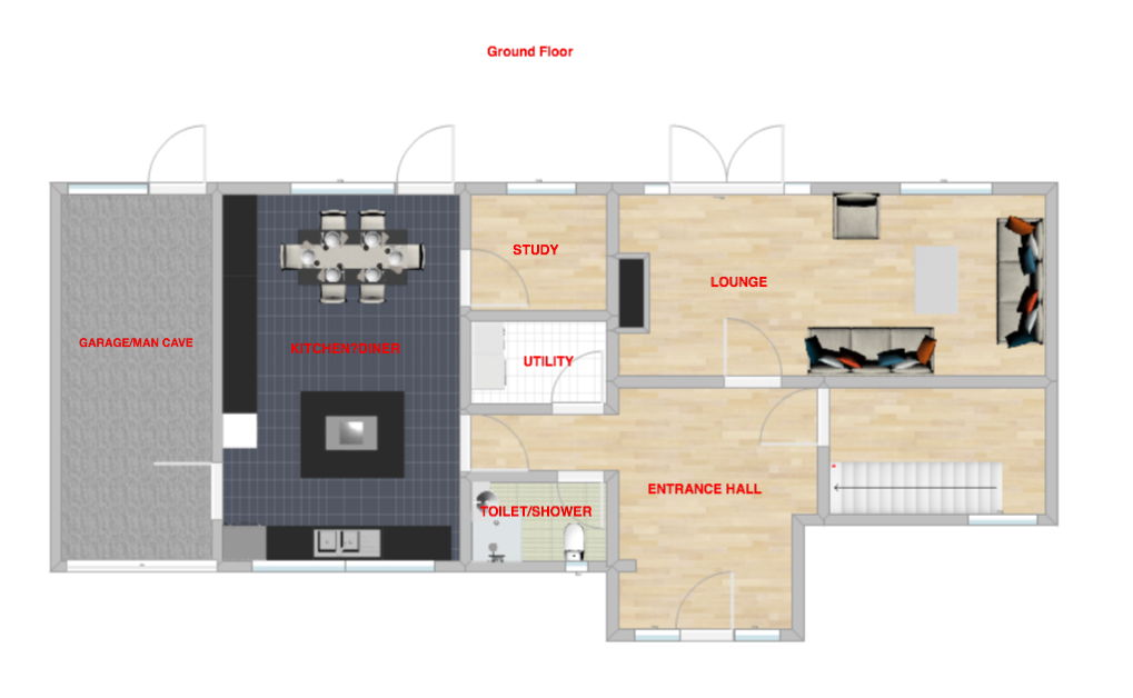 Kitchen/ Diner- 19'5'' x 13'5'' ( 5.92m x 4.1m ) An attractive range of sold Oak door kitchen units with contrasting work tops. Ceramic kitchen sink, tiled splash backs. Built in double oven. Integral dishwasher, fridge/ freezer, pull out waste bin. Central Island with gas hob and extractor. Welsh Slate flooring, 2no radiators, UPVC leaded light wood effect windows to both front and rear aspects. Door to study, door to garden, door to garage/man-cave.