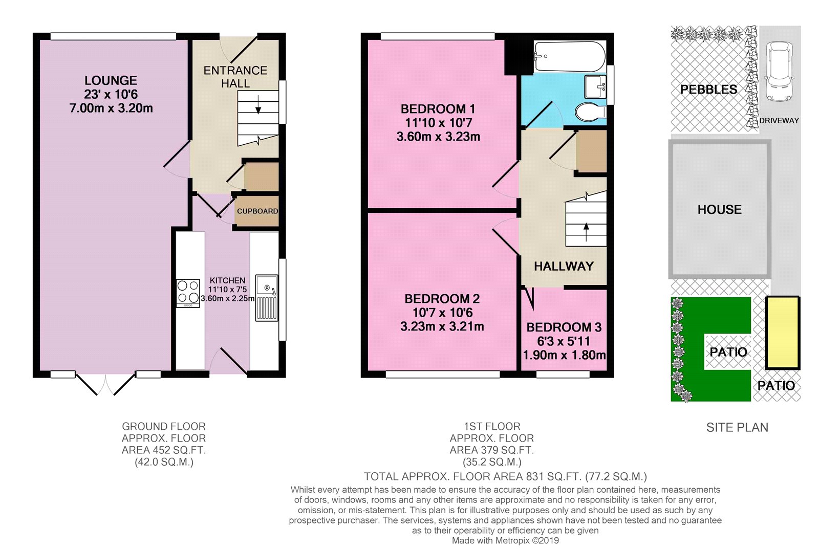 There is also a front garden with pebbles and shrubs.
