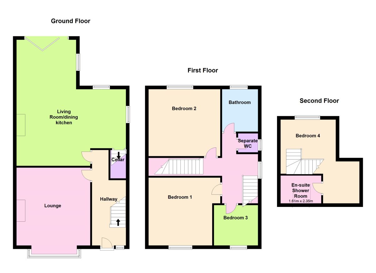 Stunning open plan L shaped room. With Bi folding doors providing access to the rear garden. Solid fuel burning stove, wood effect flooring. Kitchen area is fitted with a modern range of base and wall units with coordinating granite work top over, inset sink unit with mixer tap, integrated dishwasher, range style oven. Under floor heating, Recessed spot lighting. Access to small step down cellar area with plumbing for washer.