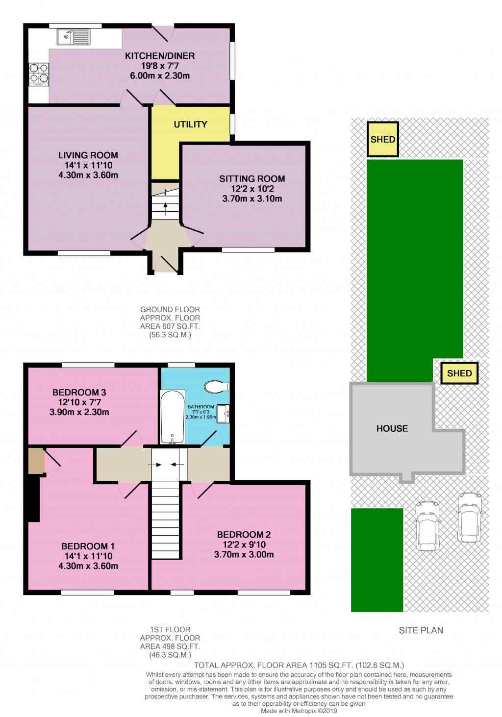 In brief, the property comprises of: Entrance hall, living room, sitting room, kitchen / dining room, utility room, 3 bedrooms and a family bathroom. Outside, driveway for 4 vehicles adjacent to lawned front garden. Large lawned rear garden with 2 timber sheds and access to front.