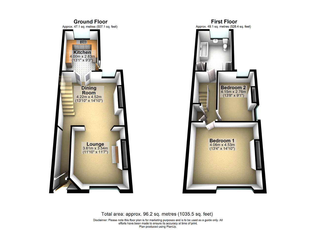 A good sized open plan lounge diner with windows to the front and rear elevation. Stairs lead to the first floor and double doors lead through to the kitchen.