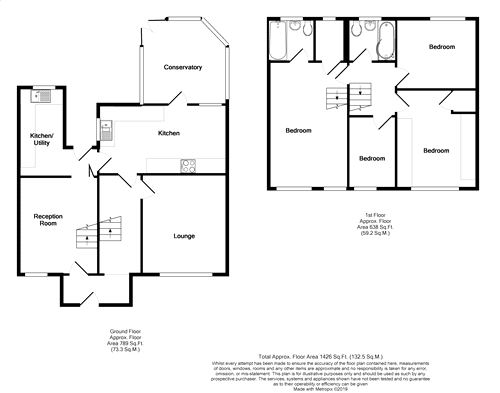 Three piece suite in white comprising panelled bath, pedestal wash hand basin, low level WC, uPVC double glazed opaque window to rear, chrome heated towel rail. Vinyl floor.