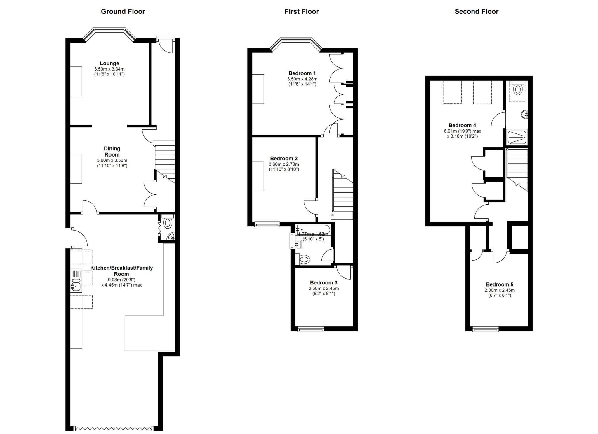 From the hall way, stairs lead to level one and three double bedrooms and a family bathroom, and then further up to level two are 2 more double bedrooms, with one offering a large living space and en suite.