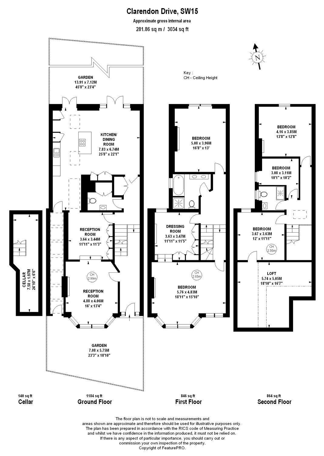 The house is laid out over three floors with two bedrooms plus the dressing room/6th bedroom on the first floor, while there are a further 3 bedrooms on the top floor. There are bathrooms on each of the floors throughout the house.