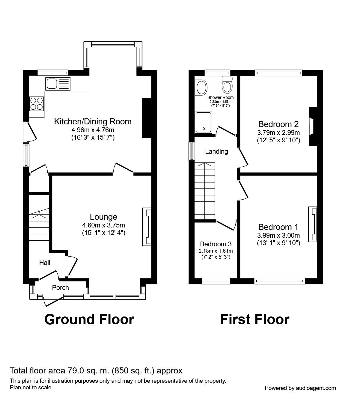 Double glazed frosted window to rear elevation. Radiator. Vinyl flooring. Part tiled walls. Three piece bathroom suite in white consisting of low level w/c, pedestal wash hand basin and walk in shower. Access to landing.