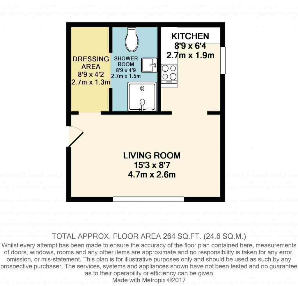 The apartment is located in a purpose built building at the end of a quiet cul de sac. The studio has a secure entry system, which provides access to the communal entrance hall. The studio apartment is on the ground floor and consists of a living/bedroom, kitchen, dressing area and shower room. The kitchen is well equipped with a electric cooker and hob, sink and free standing fridge freezer. The modern shower room has a boutique hotel feel to it and comes with a shower cubicle, WC and sink.
