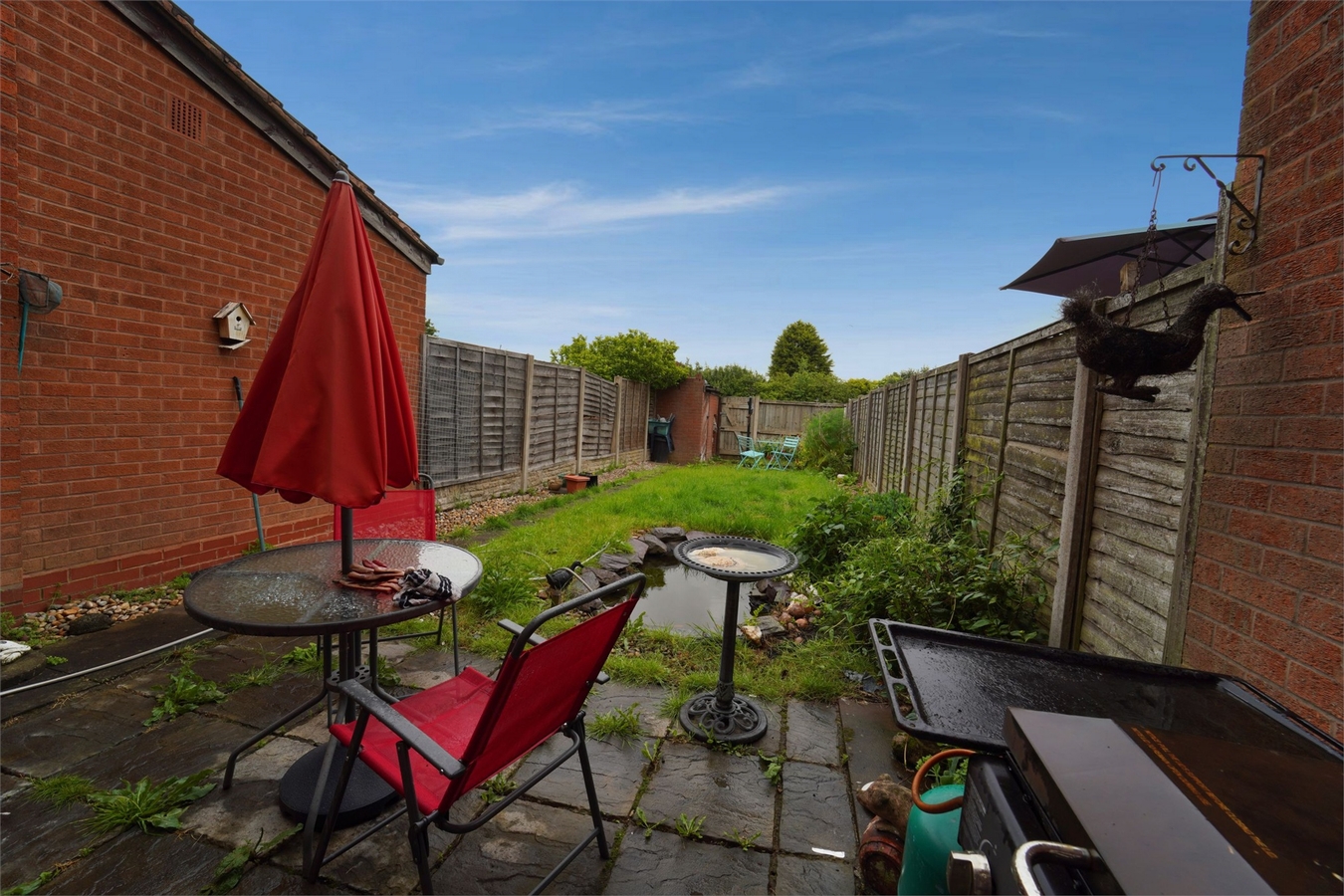 Rear - Enclosed garden that opens to patio with large area of lawn.