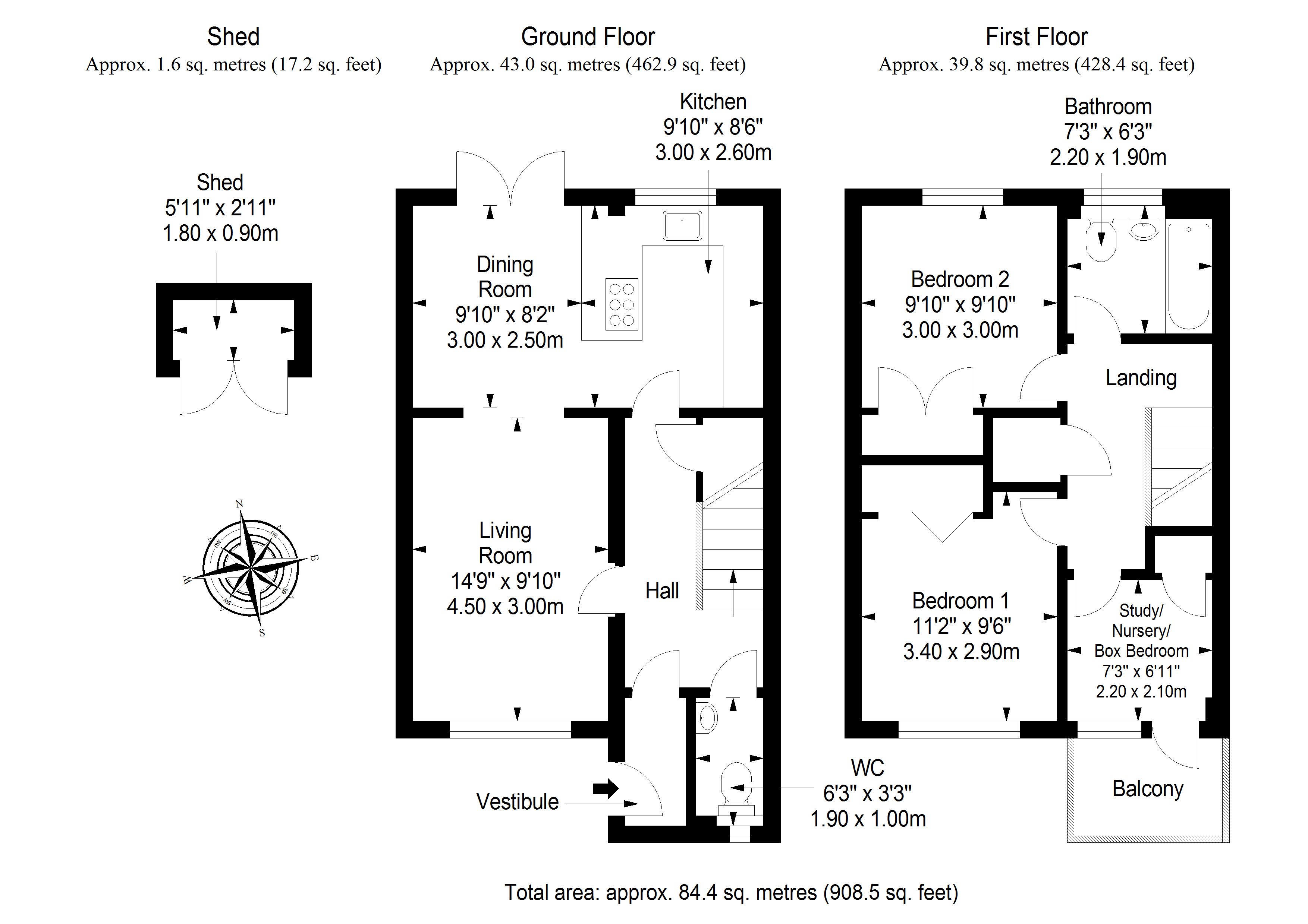 Upstairs, an airy landing accommodates storage and leads to a loft, a bathroom, two double bedrooms and a handy box bedroom. The double bedrooms are both attractively decorated and incorporate built-in wardrobes. The larger bedroom enjoys a sunny aspect and the remaining bedroom benefits from a peaceful rear-facing position. The versatile box bedroom (with handy cupboard storage) could lend itself to a variety of uses and has the added luxury of its own south-facing balcony offering lovely countryside views. Finally, a pristine bathroom comes replete with a contemporary WC suite, a shower-over-bath with a glazed screen and stylish wall tiling.