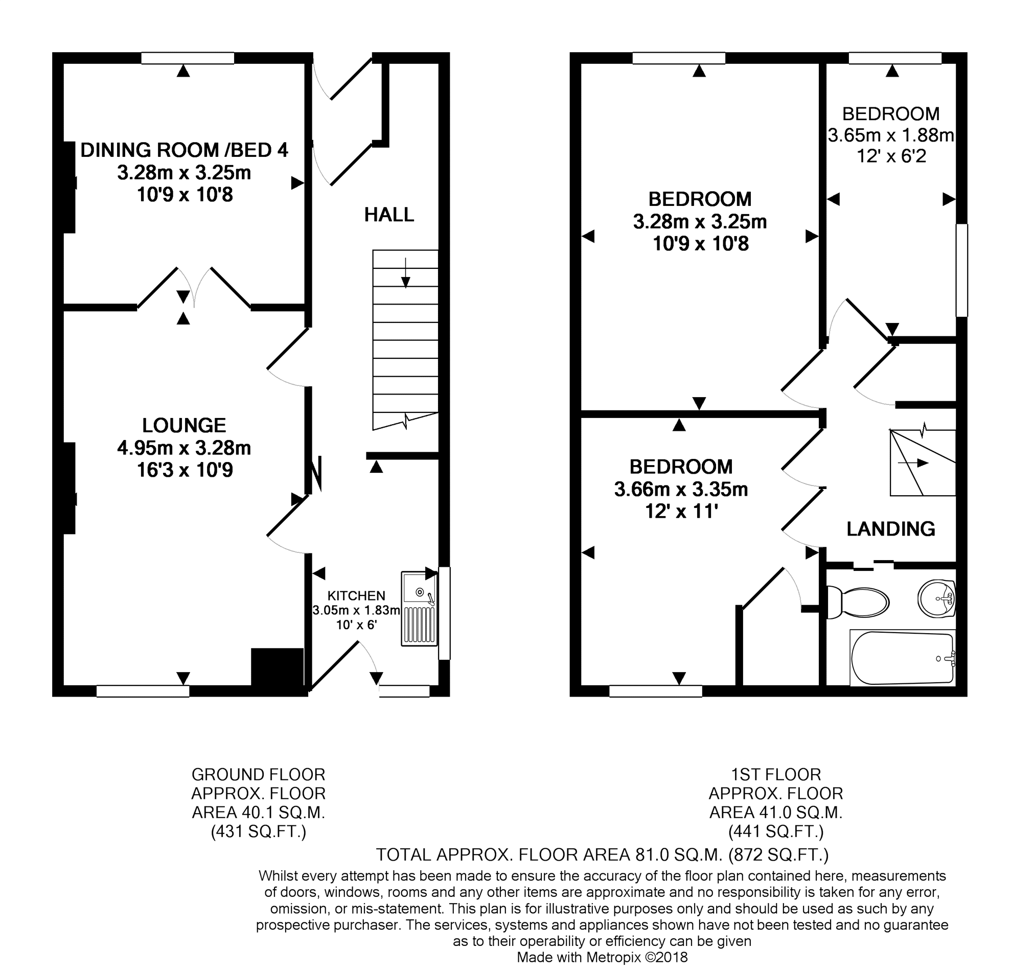 Rear aspect uPVC double glazed window with frosted glass, coloured three piece suite comprising: Panel enclosed bath with fitted Mira shower, low level WC and pedestal wash hand basin with tiled splash back. Radiator, extractor fan.