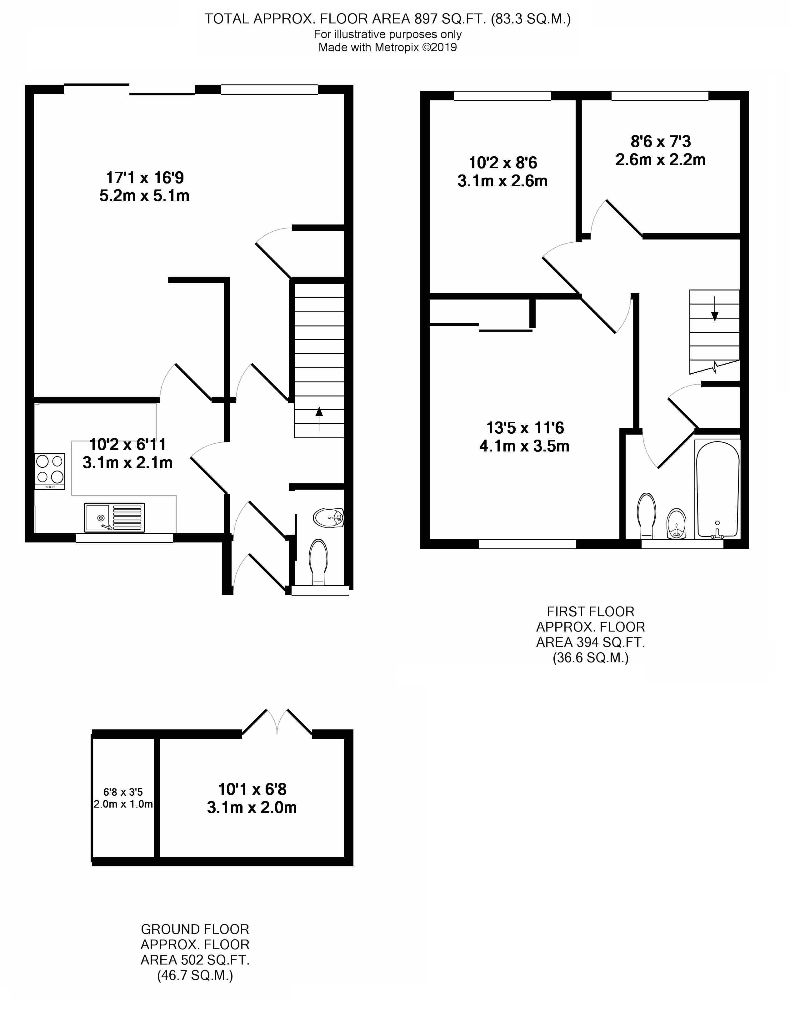 Obscured double glazed window to front, three piece white suite comprising panel bath with taps and shower attachment over, pedestal wash hand basin with mono tap over, low level WC and tiled splashbacks.