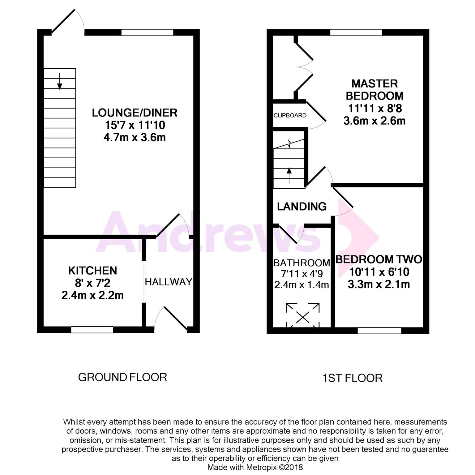 The property accommodation on the ground floor offers an entrance hall which leads you into the kitchen at the front, which has a built in hob and oven, enough space for a fridge/freezer and washing machine. The lounge/diner comes at the rear of the property and offers enough room for a table. The property offers a very pretty rear garden which has flowers/shrubs, enough room for a shed and outside table. Upstairs the property offers a master bedroom which has a built in wardrobe, a bathroom and decent sized single bedroom (10'11 x 6'10). The property further offers off street parking for two cars in front of property (one behind another). A lovely two bedroom home.