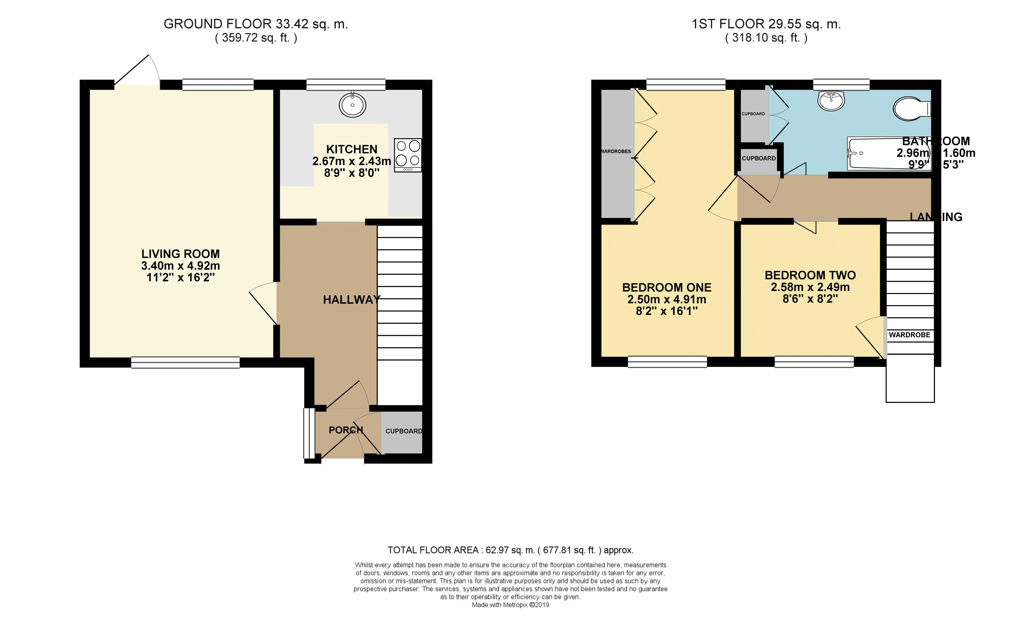 The property is approached via the paved driveway to the uPVC front door which leads into a really useful porch with storage cupboard. The porch opens into the spacious hallway with stairs rising to the first floor, under stairs storage cupboard, door to sitting room and doorway to kitchen. The kitchen is fitted out with a range of matching wall base units, roll top worksurfaces, integrated oven hob and extractor and spaces for appliances. The dual aspect comfortable sitting room is spacious, very light and airy and has a door to the rear garden. On the first floor there are two good size bedrooms especially the dual aspect master with its fitted wardrobes, and a family bathroom with more storage and a shower over bath.
