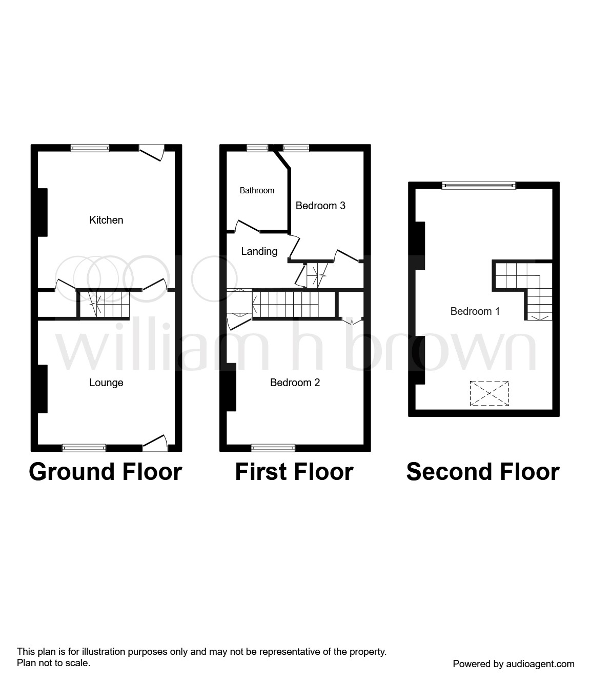 A carpeted landing leads to second and third bedrooms, bathroom and stairs to the second floor.