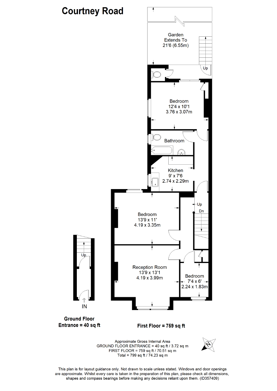 First floor three bedroom maisonette, with two double bedrooms, single bedroom, family bathroom and separate WC, stairs down to private garden.
