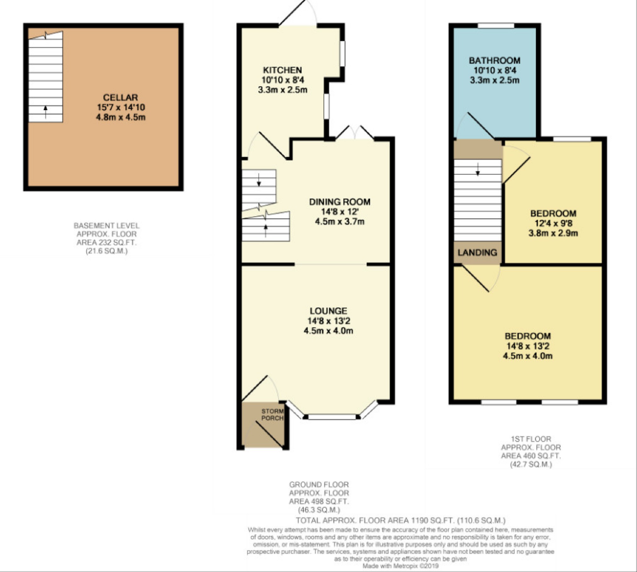 Fitted with a modern range of wall and base units in a light Maple finish with dark Grey worktops and inset sink and drainer. Integrated oven, gas hob and chimney hood. Tiled floor and splash back. Two double glazed windows to the side and UPVC door to the rear. Stairs lead down to the large cellar room room.