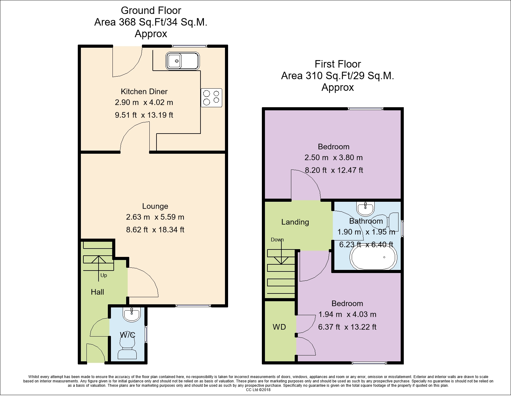 Heading upstairs there are two generously sized bedrooms, with the larger master bedroom offering ample space for a large wardrobe and a double bed. The property has a good sized family bathroom, and a guest bathroom downstairs.