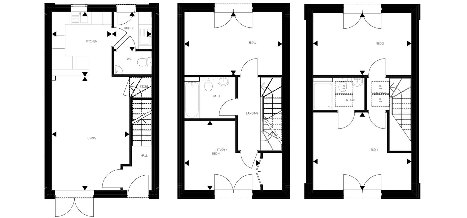 This property is unique to the development and offers superb family accommodation. Arranged over three floors, this uniquely designed property comprises an entrance hall and a large open plan kitchen / living room with patio doors to the front of the property making it perfect for entertaining. A utility room and downstairs WC complete the ground floor. The first floor features two large bedrooms and on the second floor is a large master bedroom with en-suite and one further bedroom. All of the bedrooms feature Juliet balconies. The property includes a single carport.