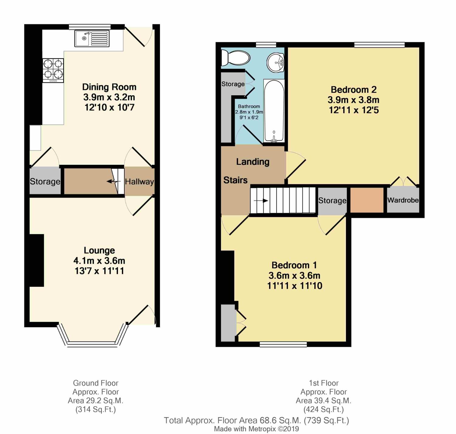 First floor landing, front facing master bedroom with built in double and separate storage cupboard, rear facing bedroom two with built in double wardrobe and modern bathroom fitted with a three piece suite in white comprising: Wash hand basin, low flush wc and bath with shower screen and mains shower above. Tiling to splash backs, towel ladder radiator and airing cupboard.