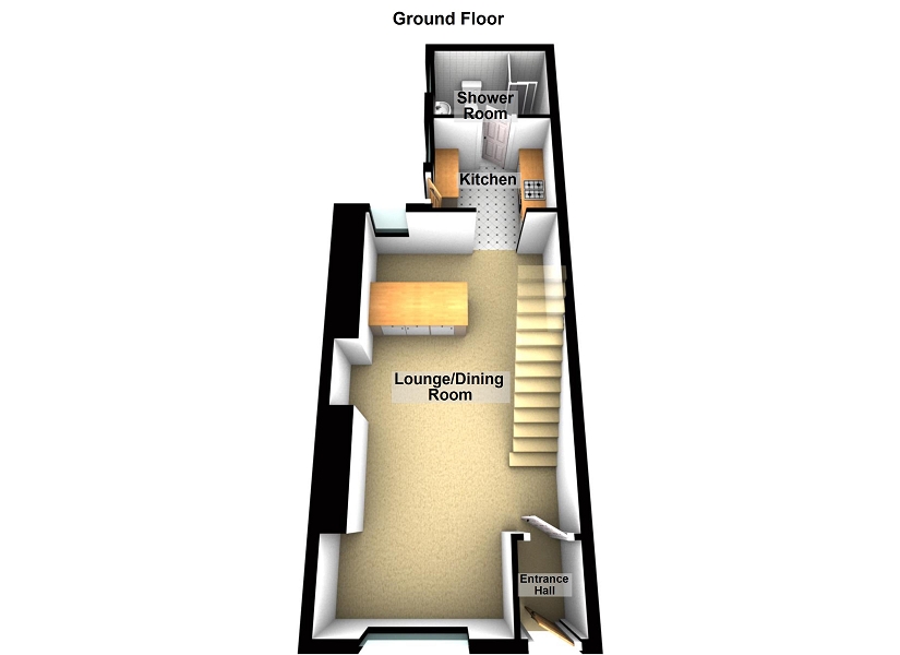 Hardwood double glazed window to front, UPVC double glazed window to rear, two double radiators, partially carpeted and laminate flooring, coving to ceiling, stairs to first floor, base level units with sink unit and drainer.