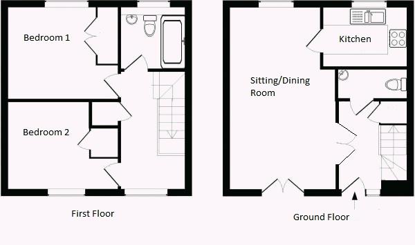 The accommodation comprises entrance hall, downstairs cloakroom, double aspect sitting room/diner, fitted kitchen, two double bedrooms (both with built-in wardrobes) and a bathroom.