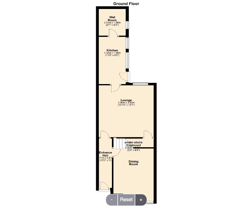 PVCu double glazed window to rear, living flame effect gas fire with feature surround, radiator, fitted carpet, door to the kitchen and door to the under stairs cupboard.