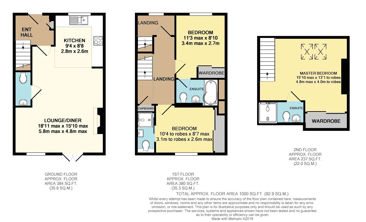 The first floor offers two excellent bedrooms, each featuring fitted wardrobes. One has an ensuite bathroom, the other an ensuite with walk-in shower. On the second floor is a superb spacious master bedroom with deep fitted wardrobe and ensuite shower room.