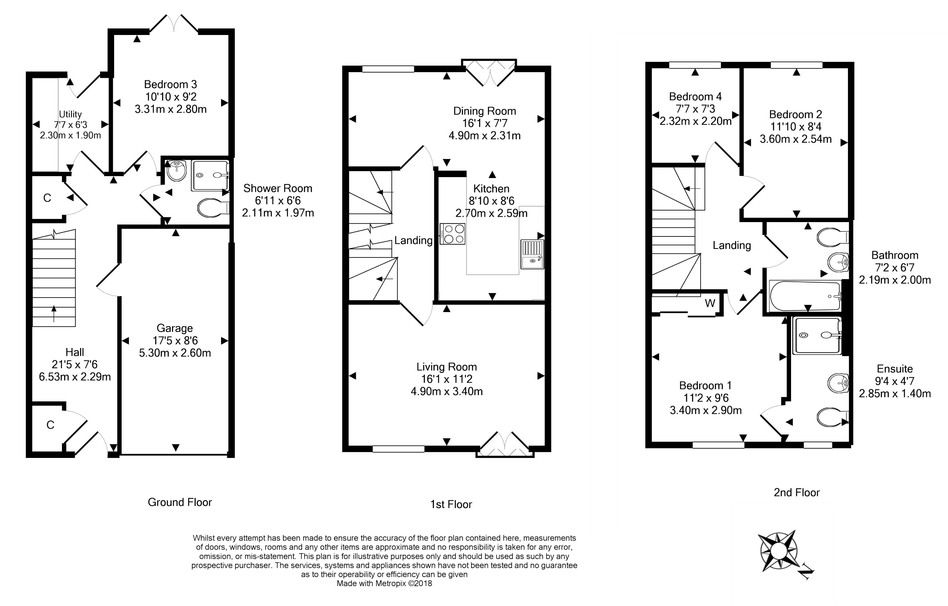 The accommodation on offer comprises : At ground floor level, a welcoming entrance hall, Shower room, bedroom 3/family room with French doors leading out to the garden and a handy utility room. A carpeted staircase leads to the first floor landing which gives access to the sitting room with French doors and Juliet balcony, a modern fully fitted kitchen/dining room again with French doors to a Juliet balcony. A further carpeted staircase leads to the top floor which houses the master bedroom with fitted wardrobes and an en-suite shower room, a further double bedroom, a single bedroom/study and the family bathroom with white three piece suite. The property benefits from gas central heating, double glazing and enclosed, well maintained gardens to the rear of the property with a double length driveway to the front providing off street parking and giving access to the integrated garage which has up and over front door, power and light.