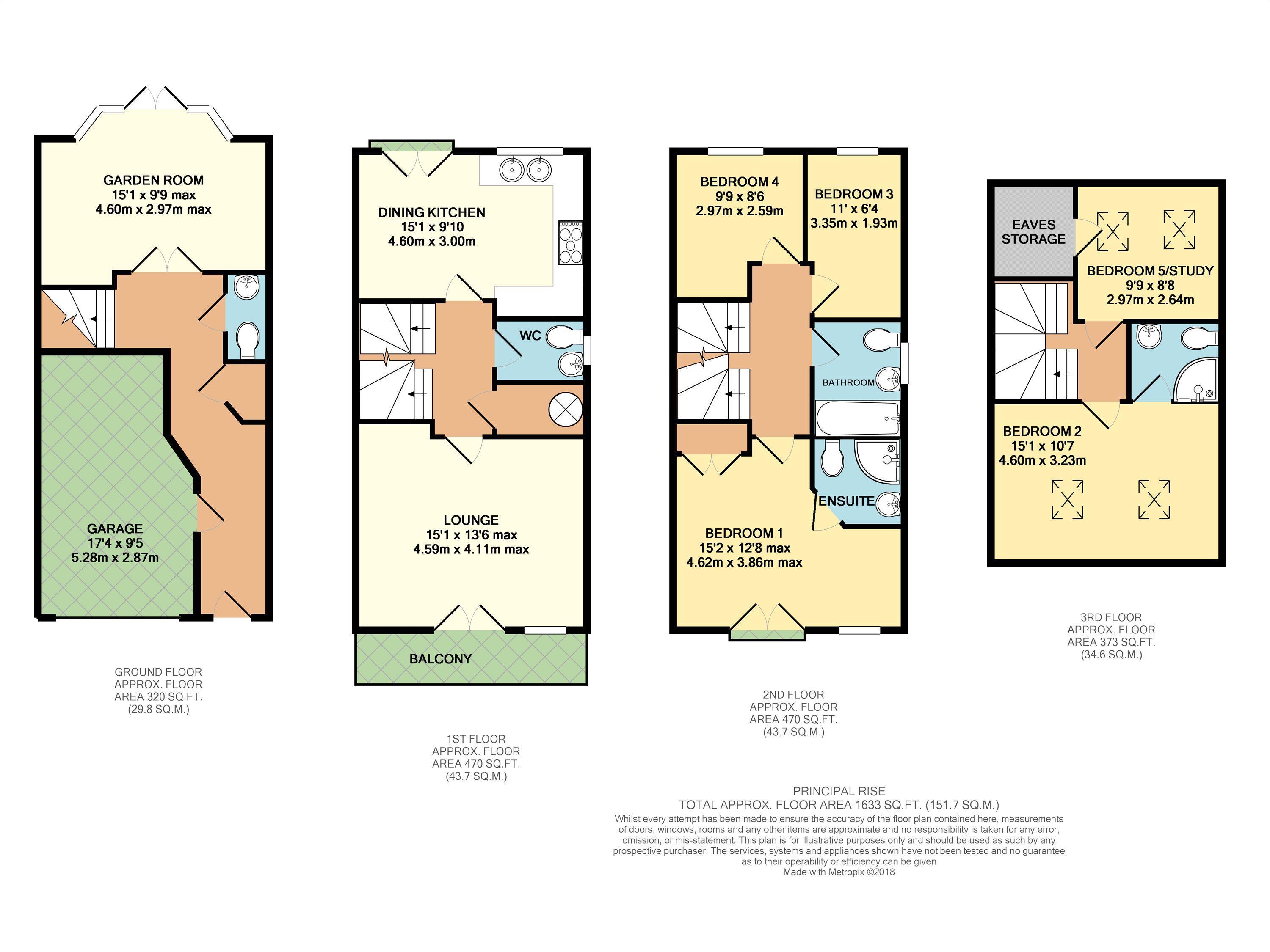 Extending to over 1600 sq ft, the accommodation incorporates a welcoming entrance hallway with access to the garage, WC /cloakroom and garden room to the ground floor, formal living room with balcony and kitchen / dining room to the first floor with an additional WC and storage cupboard. The second floor offers a master bedroom with an en-suite shower room, two further bedrooms and a family bathroom. On the third floor there are two good sized bedrooms, one currently used as a study and the other incorporating an en-suite shower room. Externally there is a block paved driveway to the front providing off street parking leading to an integral single garage and a west facing rear garden fully enclosed by trellis fencing.