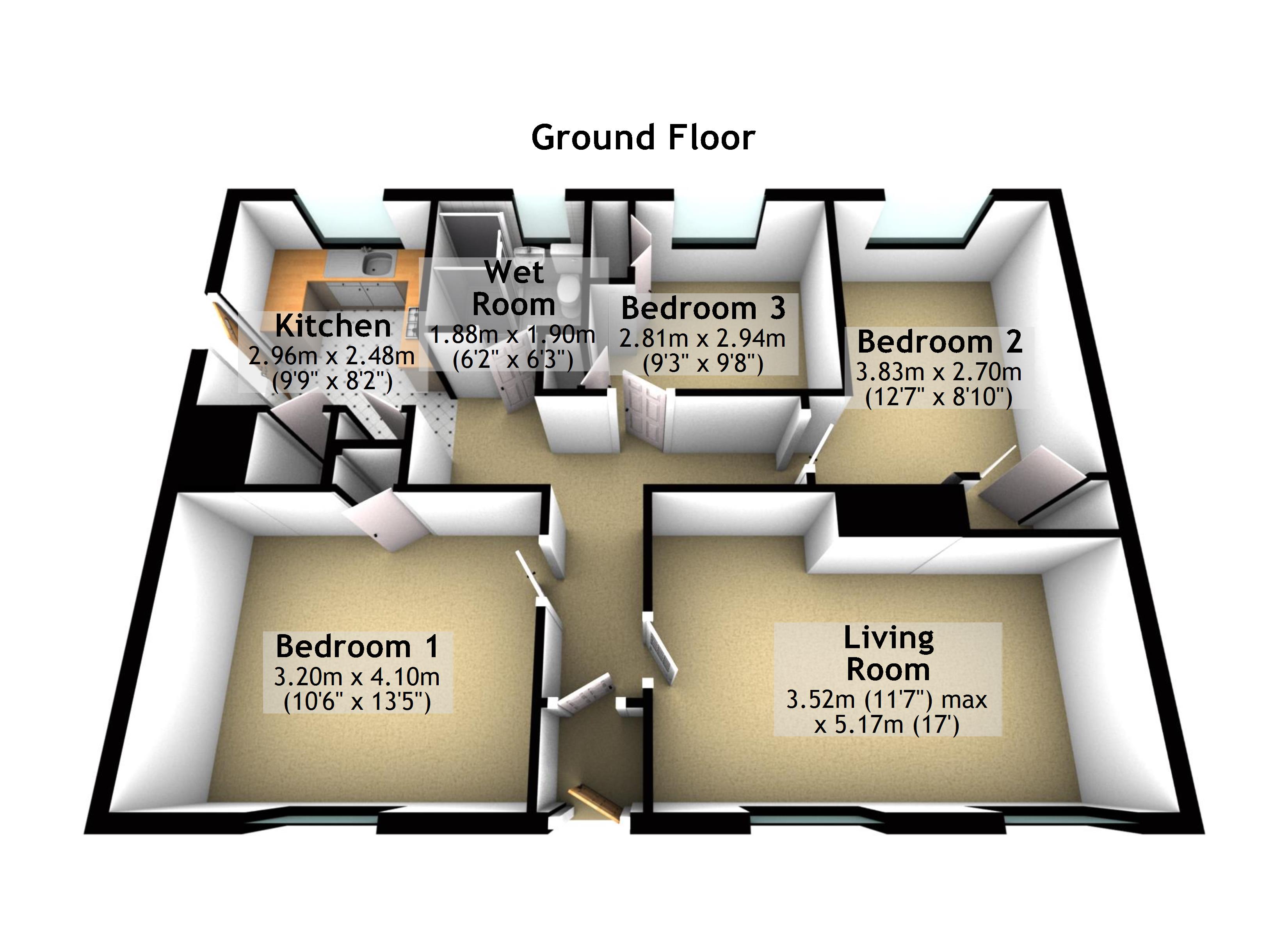 This main door villa is brought to the market in good condition with scope for some cosmetic upgrading, the rooms are well proportioned making this an ideal early family home. Comprising of a main door entrance with access to all rooms, a bright front facing lounge with large windows and feature electric fire. The kitchen is modern and comes equipped with integrated hob, electric oven, extractor hood, pantry storage and access to the gardens. The master double bedroom with built-in storage overlooks the front of the property with two further double bedrooms providing built-in storage and ample space for free-standing furniture at the rear. A fully tiled white suite shower room with extractor fan completes the rooms.